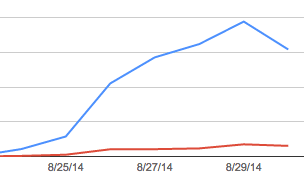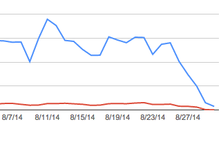 The OMGWTF-moment. For about 5 seconds I forgot how to breathe. I started checking the websites SERP rankings right there in WMT and discovered that most pages have moved down by 1-4 positions, and some pages went down even further, by a whooping -20 positions. By the end of the week the number of "impressions" was down by 90%, the "clicks" were down by 60%. This felt scary as hell, especially considering all the rumors about Google testing Penguin 3.0 in August. Playing with the date-filters I discovered this started happening exactly 36 hours after the SSL-move.
