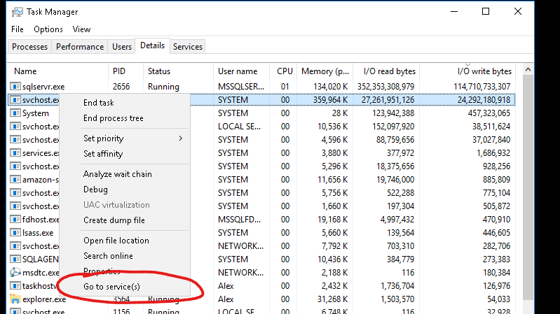 If you see the "svchost" process among the top I/O consumers - it means the load is caused by some system service running behind this process. To discover the actual service hiding behind it click "Go to services"