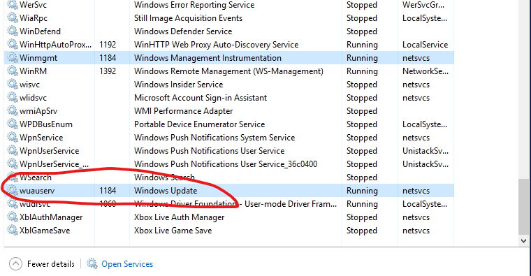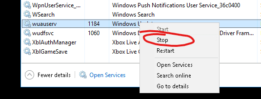 First, stop the Windows Update service (can take a while):