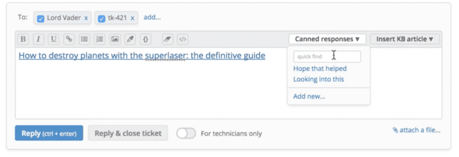 There is a more efficient way with knowledge bases directly connected to your ticketing system. These can streamline your responses by automatically suggesting knowledge base material that should be sent in response to the ticket. JitBit has canned responses and automated suggestions, for example.